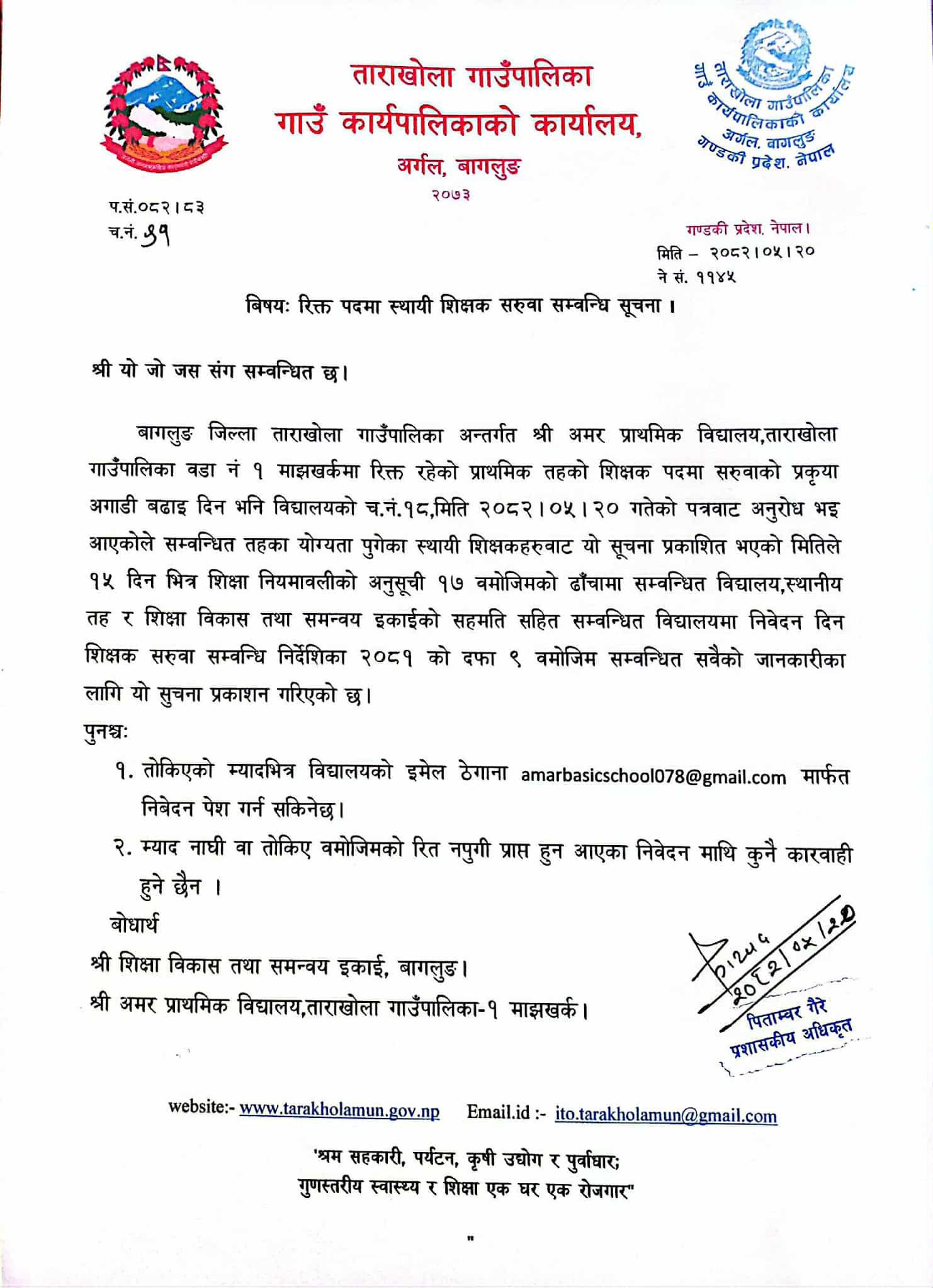 ताराखोला गाउँपालिका बागलुङको शिक्षक सरुवा सम्बन्धी सूचना ।download
